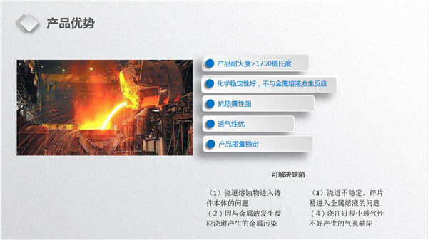 我司是研發(fā)、生產(chǎn)鑄造專用高溫陶瓷澆道管、橫澆道、直澆道、內(nèi)澆道、澆口杯、過濾座等系列產(chǎn)品的高科技企業(yè),耐火陶瓷管產(chǎn)品性能在行業(yè)中處于領先地位,填補了國內(nèi)空白,是提高鑄件內(nèi)在質(zhì)量的必備輔助材料。在中國是核電、高鐵及跨國大型鑄造集團指定耐火澆道供應商。經(jīng)過應流股份(603308)、中車集團株洲電力機車有限公司、中車集團長江車輛有限公司銅陵分公司,株洲斯威鐵路產(chǎn)品有限公司、泰鋼合金(深圳)、Metso Outotec、andritz、江蘇神通閥門股份有限公司等數(shù)十家集團企業(yè)的使用,一致認為該系列產(chǎn)品能有效提高鑄件質(zhì)量。特別是對檢測手段嚴格的高端鑄件質(zhì)量提高明顯。廣泛用于高端鑄造企業(yè)生產(chǎn)核電、礦機、高鐵、風電等高端鑄件。